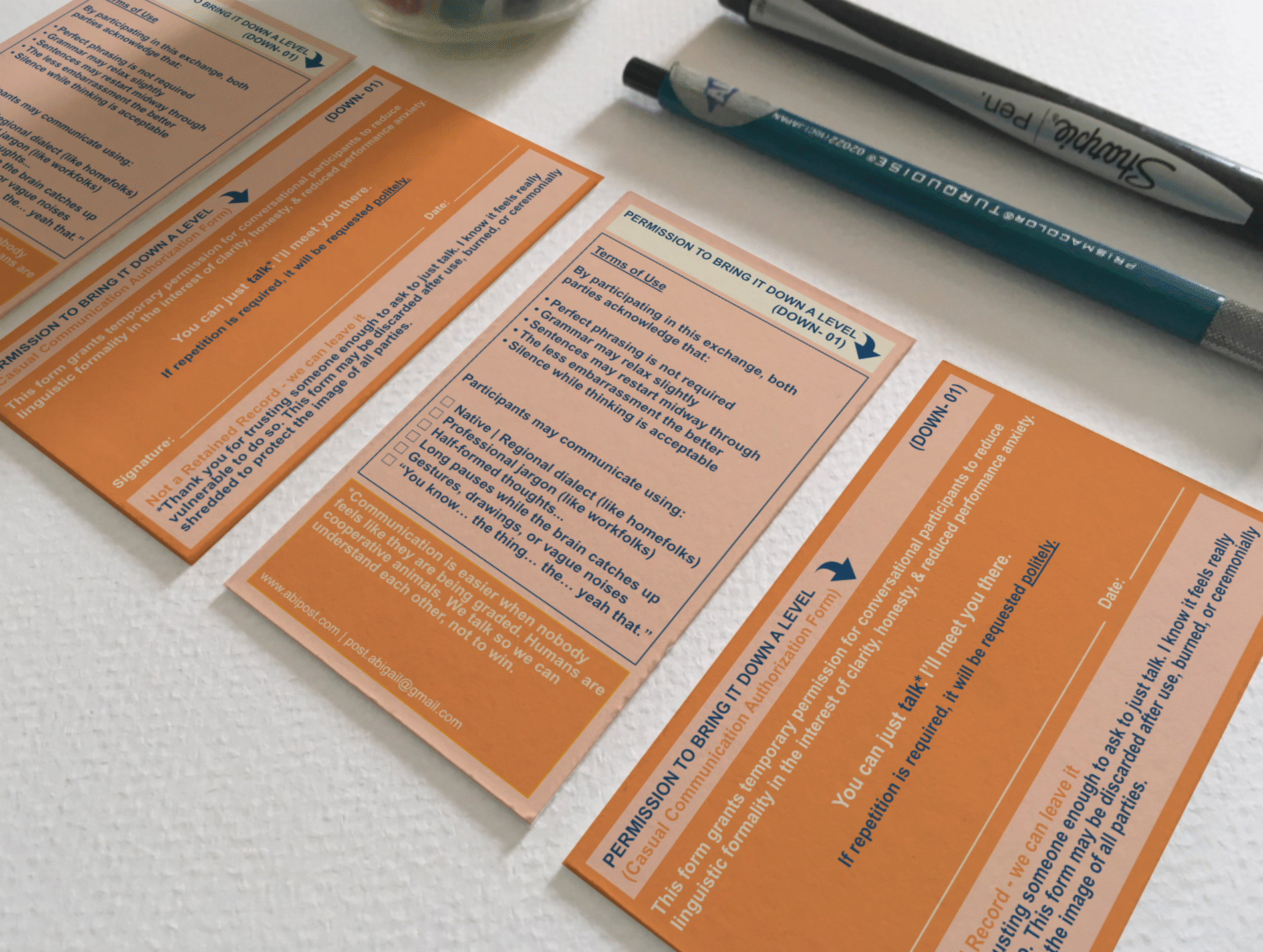 This form grants temporary permission for conversational participants to reduce linguistic formality in the interest of clarity, honesty, & reduced performance anxiety.