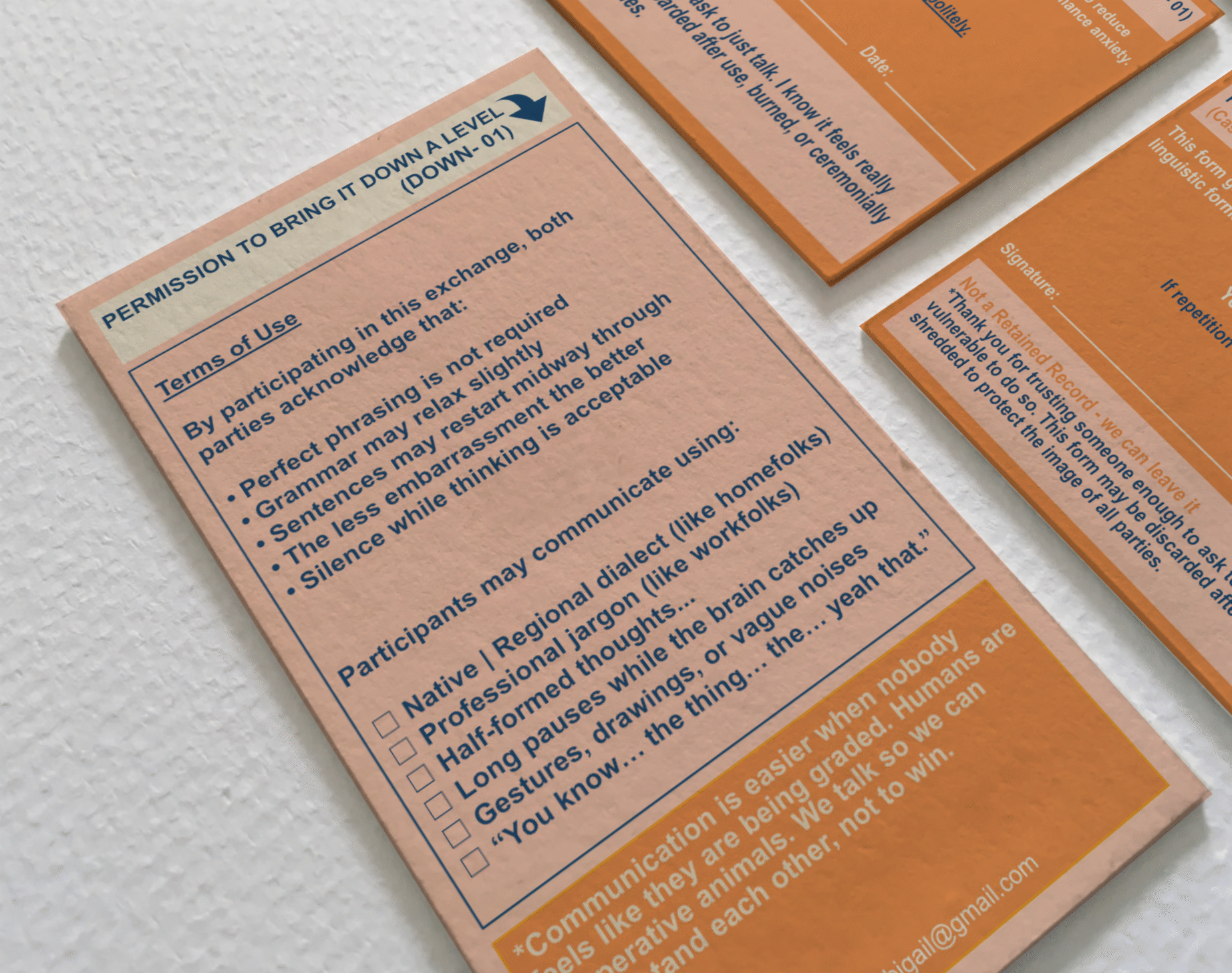 Like the other cards in this series, Bringing It Down a Level transforms an everyday social negotiation into a playful administrative form. By lowering the linguistic stakes, the work creates space for more direct communication and reminds us that understanding does not require performance.