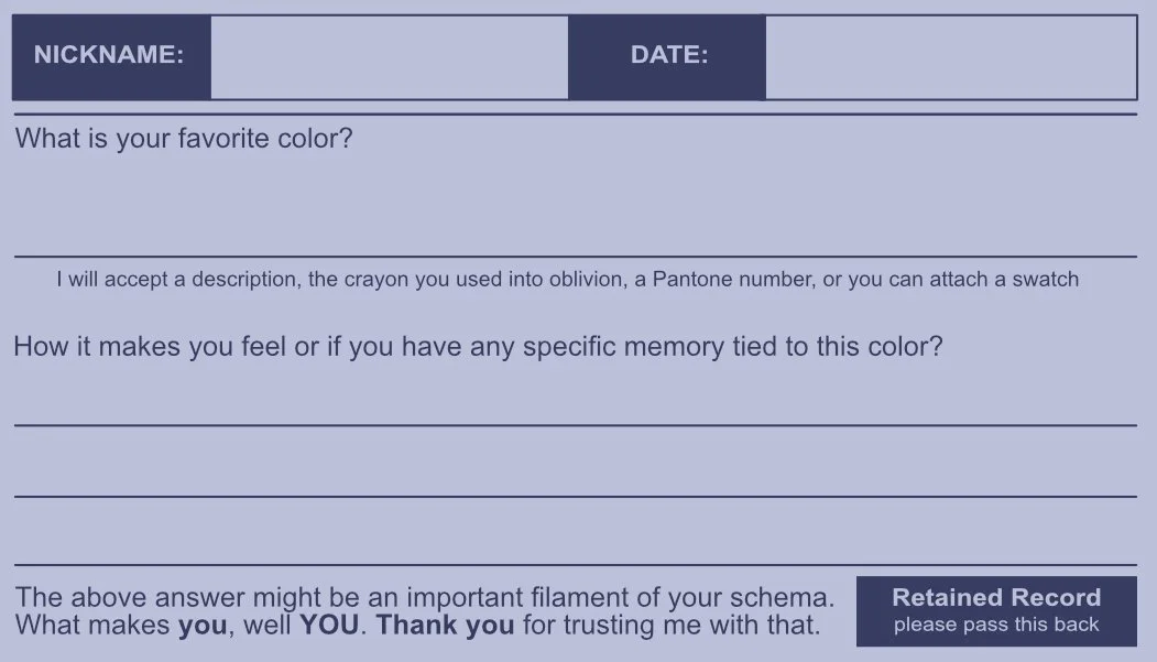 Framed through the language and structure of institutional paperwork, the card transforms an ordinary question into a moment of reflection. Participants are encouraged to consider how small preferences and memories contribute to the internal patterns that shape identity.