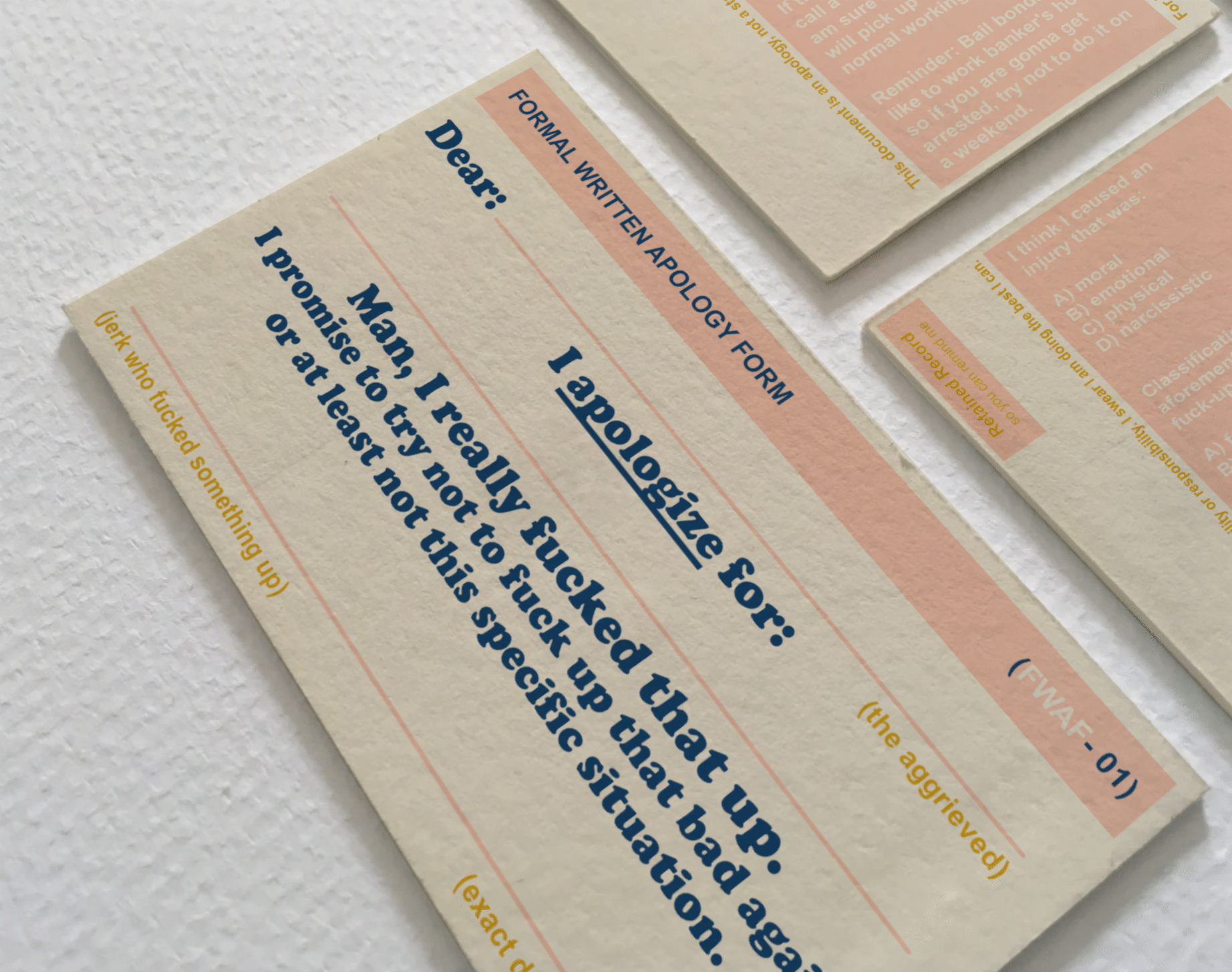 Like the other cards in this series, Formal Apology borrows the visual authority of bureaucracy to examine everyday social negotiations. By giving shape to an act that is frequently avoided or mishandled, the card encourages reflection on accountability, communication, and the possibility of repair.