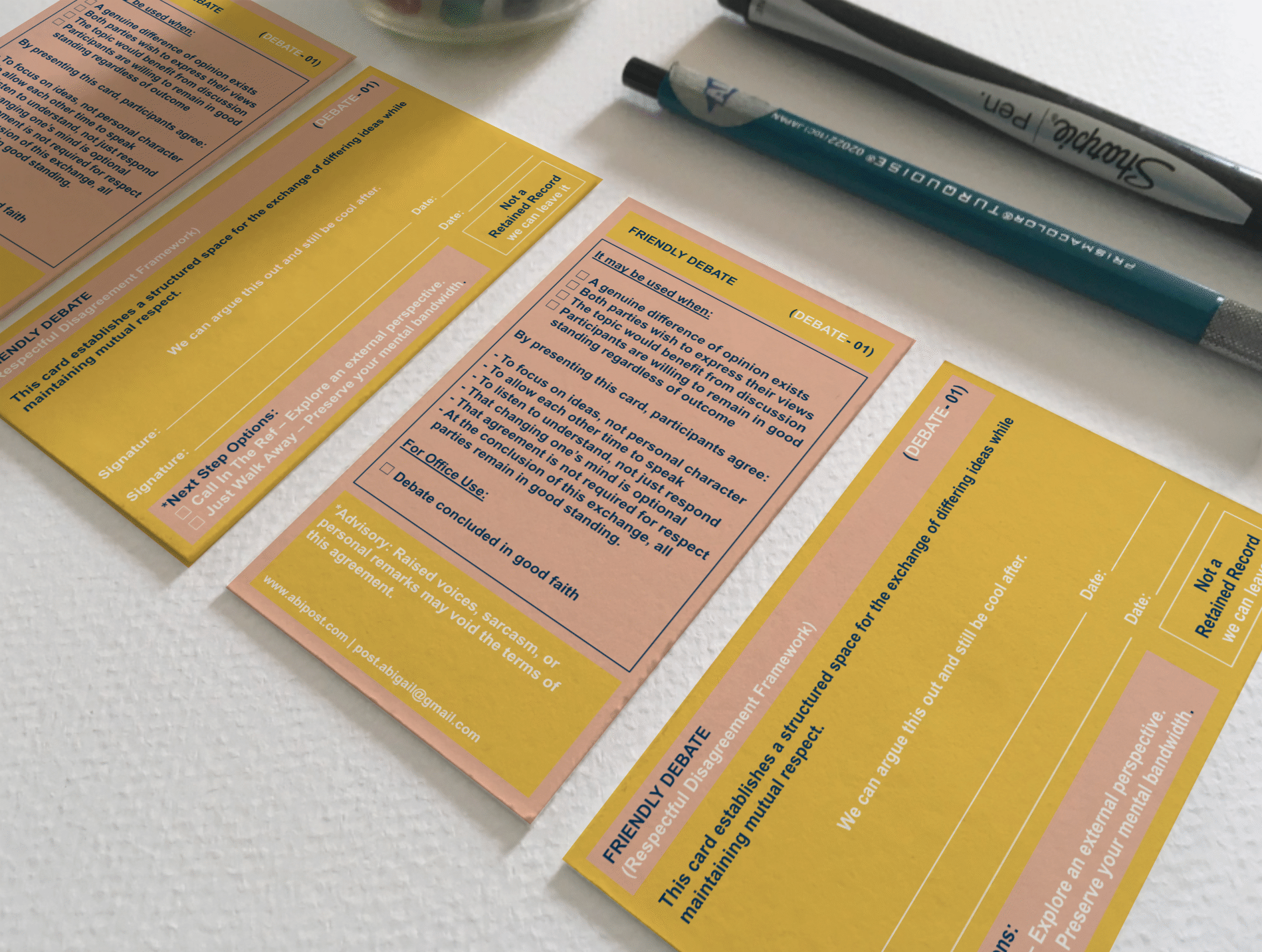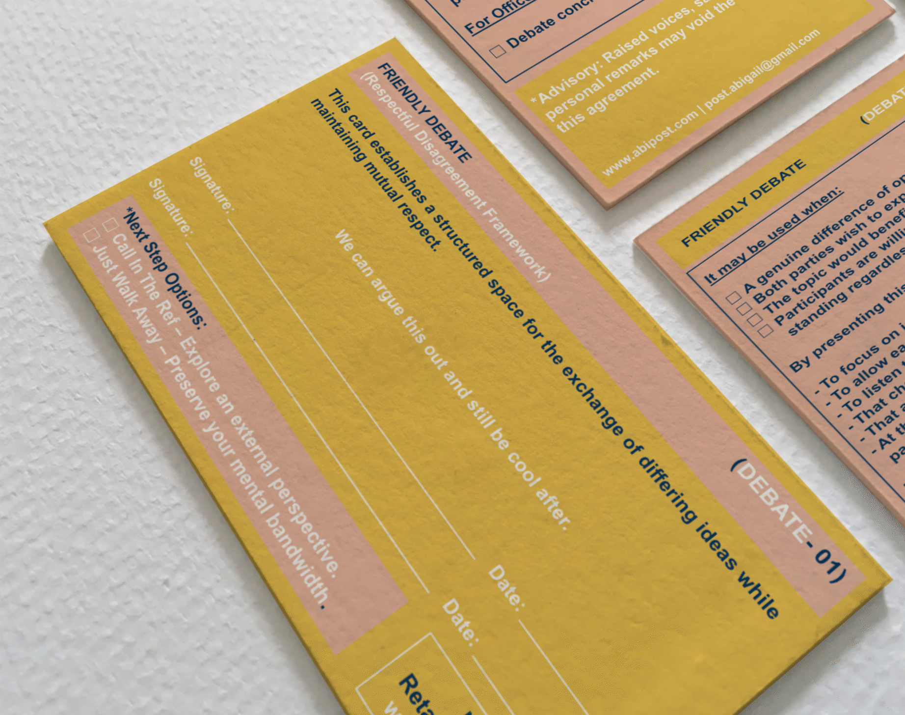 The card reframes disagreement as a cooperative exchange rather than a competitive one, emphasizing the distinction between challenging ideas and challenging people. By introducing a shared agreement of conduct, the work allows for expression, tension, and resolution without requiring consensus.
