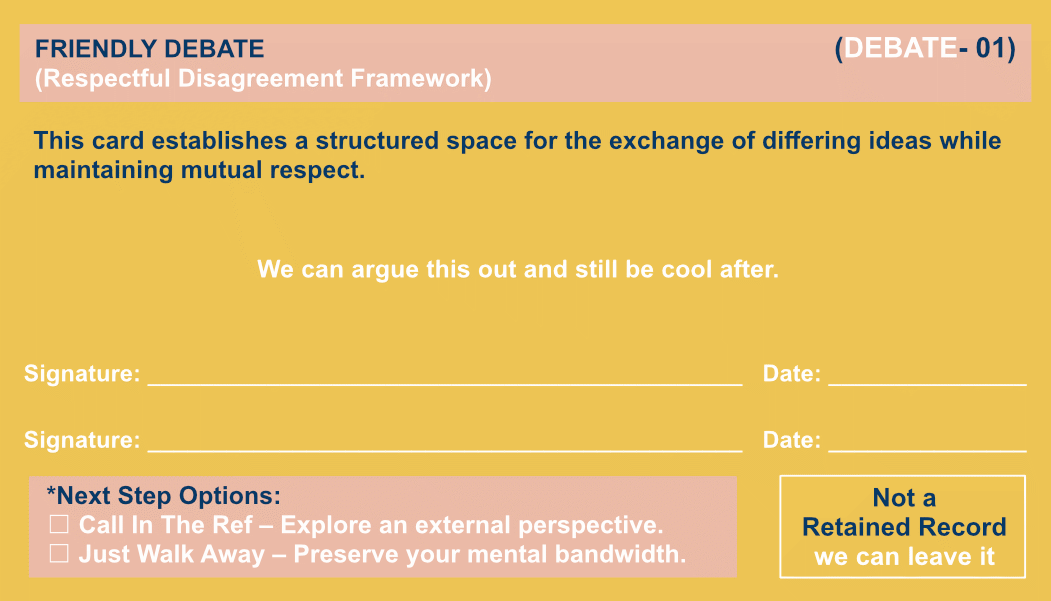 Friendly Debate creates a structured space for disagreement without social rupture. While differing opinions are a natural part of human interaction, they often escalate into conflict when not clearly defined or contained.