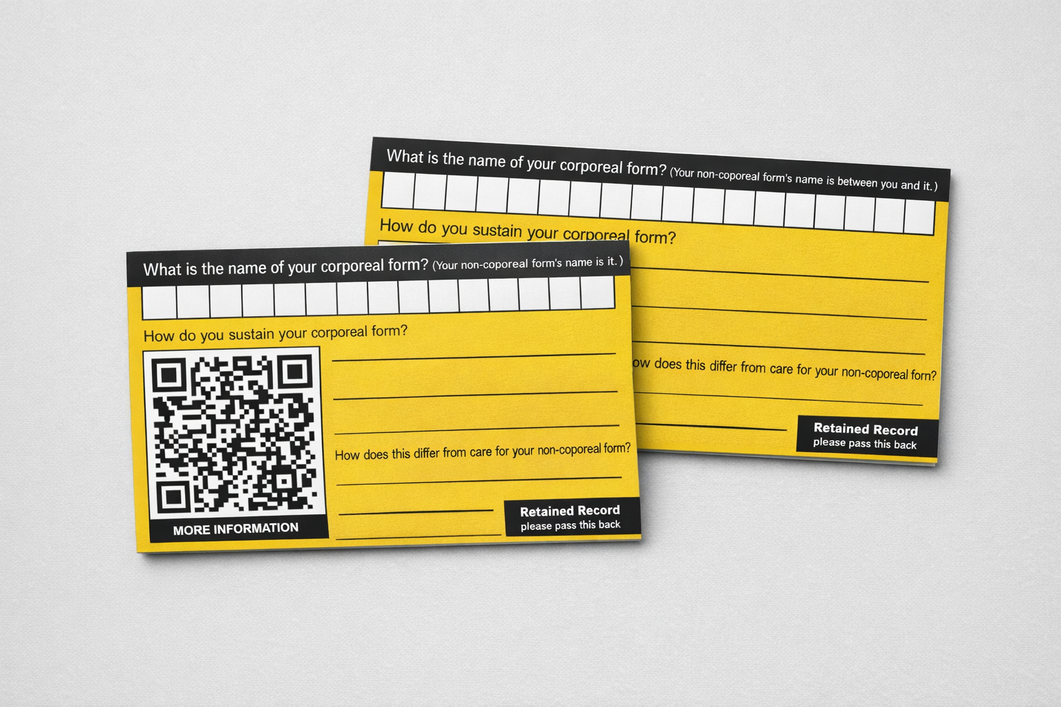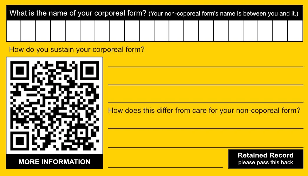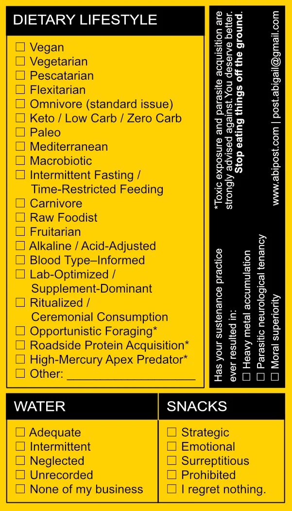 The Hunger Administration card asks a simple, absurd question: “How do you sustain your corporeal form?” Using official-looking language, maximalist diet categories, and playful disclaimers, it turns self-reflection into a moment of humor and curiosity. Participants are invited to consider their habits, quirks, and choices — and to do so with compassion for themselves and others.