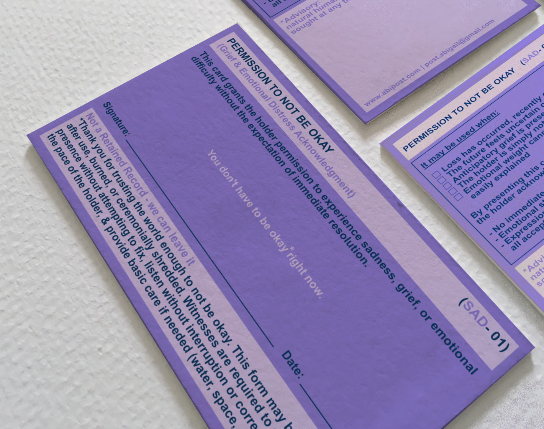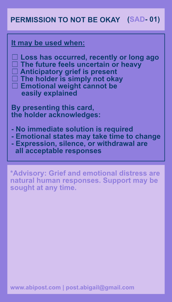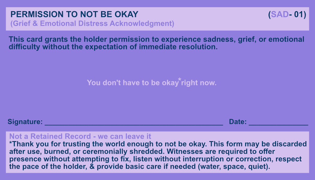 By framing this permission through the language of an administrative form, the work emphasizes witnessing over intervention. It invites both the holder and the observer to allow emotion to exist without immediately attempting to change it.