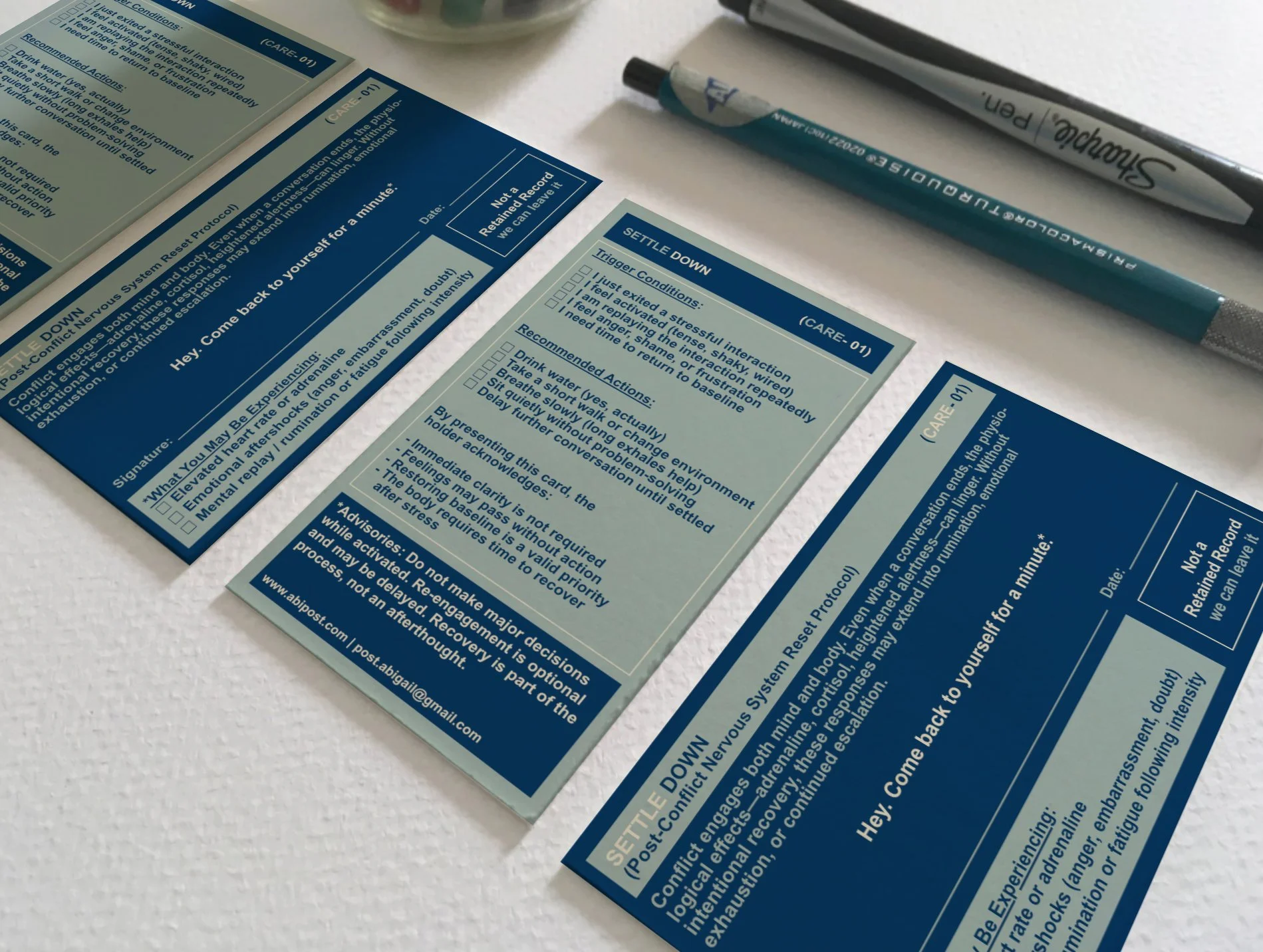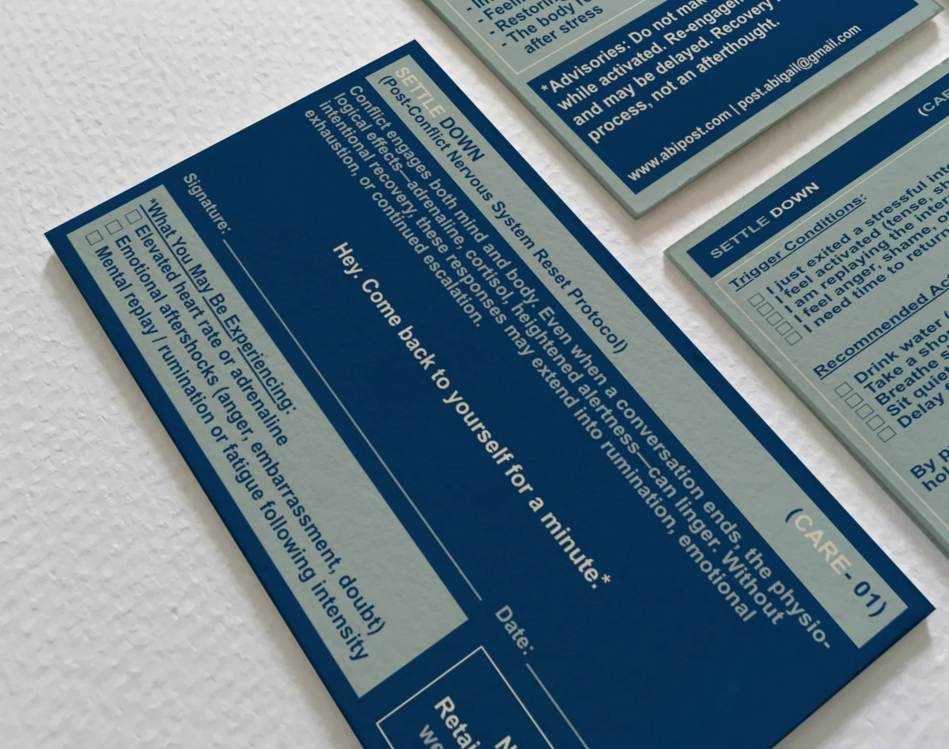 This card introduces aftercare as a structured and intentional practice. By offering simple actions and normalizing post-conflict reactions, it creates space for recovery without judgment or urgency. Framed within the language of institutional procedure, the work highlights the disconnect between how seriously we take conflict and how little we support recovery from it.