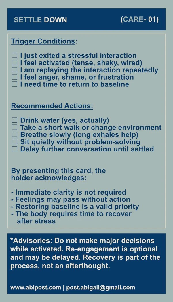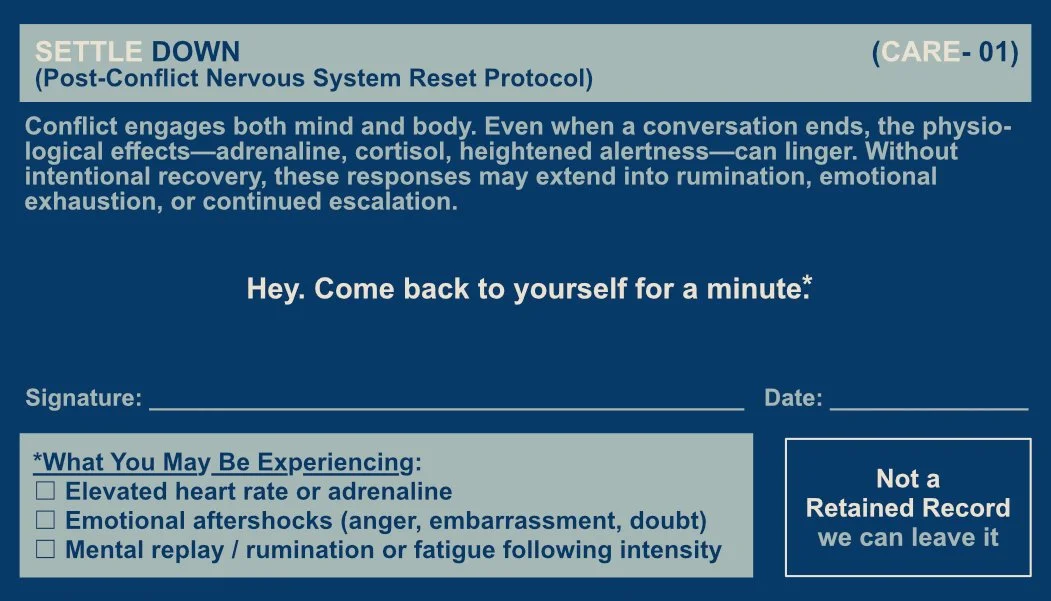 Everyone focuses on the argument itself, and then just… releases people back into the wild with their nervous systems still ringing like a fire alarm. “Settle Down” is aftercare. It’s the decompression chamber after pressure. Without it, even a “resolved” interaction leaves residue.